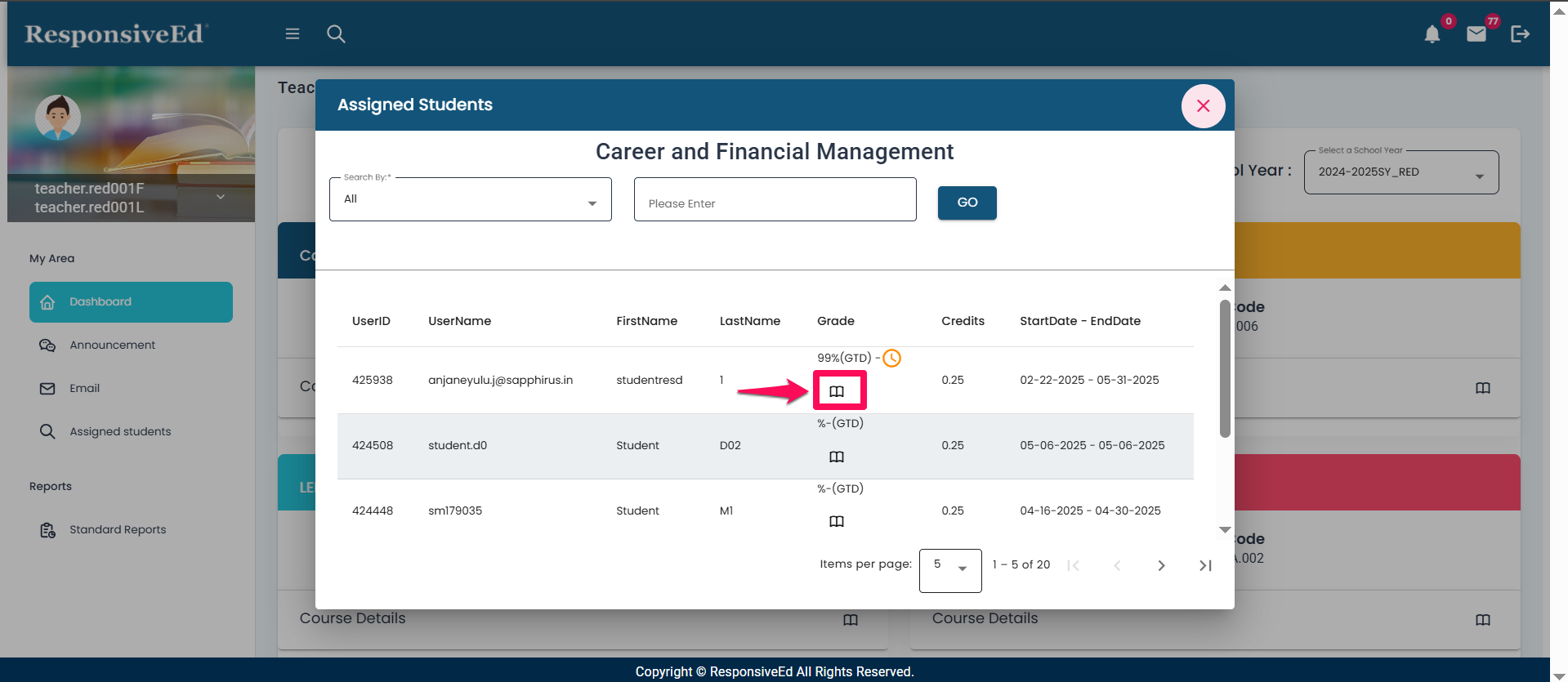 - Click on the book icon of a student within the Grade tab which will display the 'Grade Book' of that student.