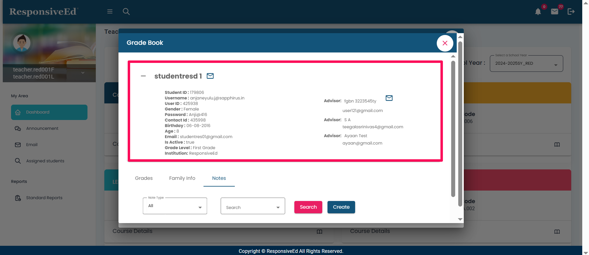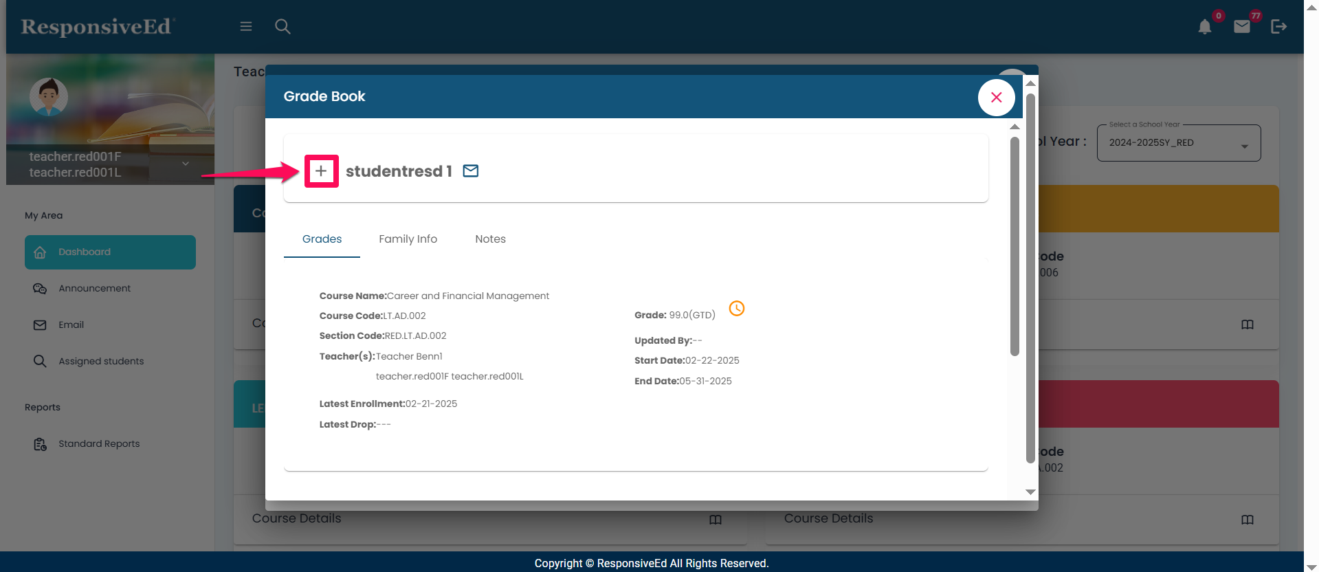 - Click the '+' icon against the student name to display the Student detailed information.