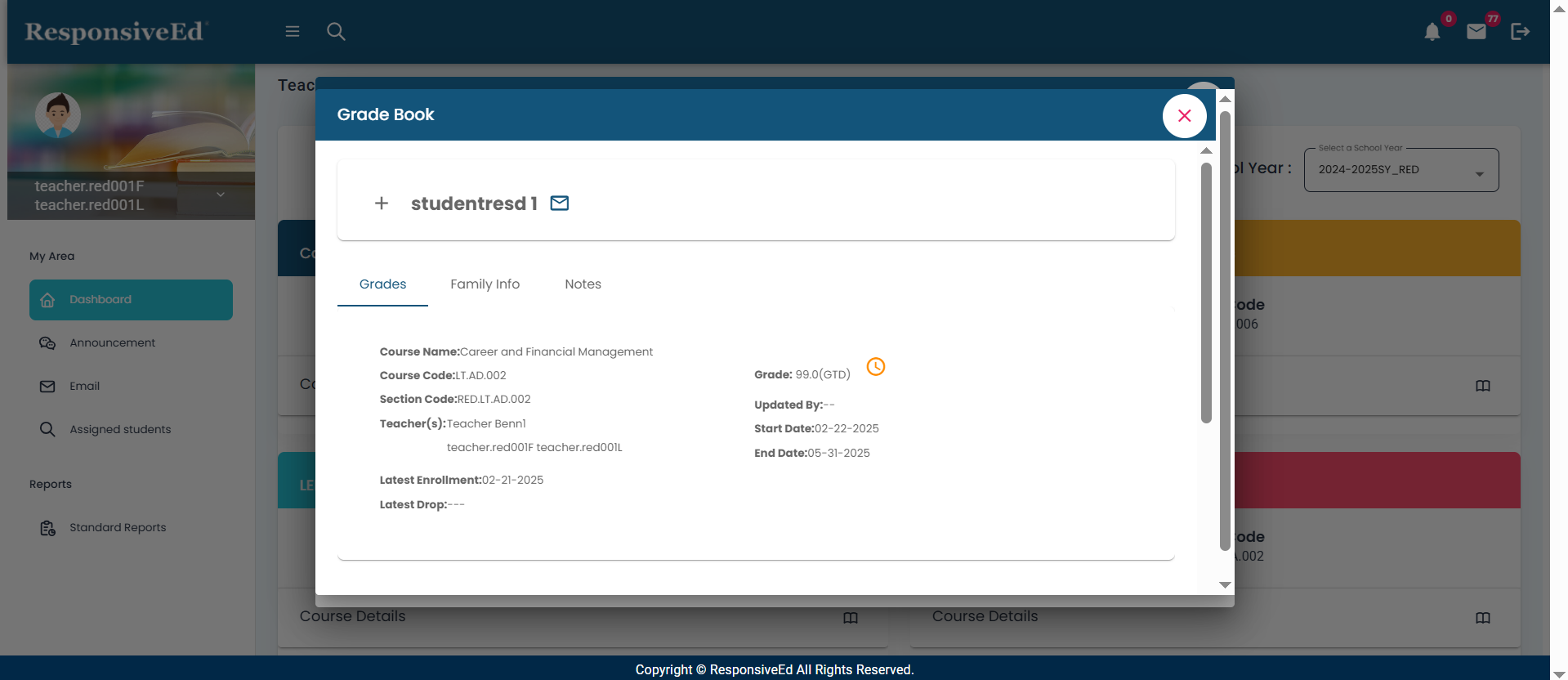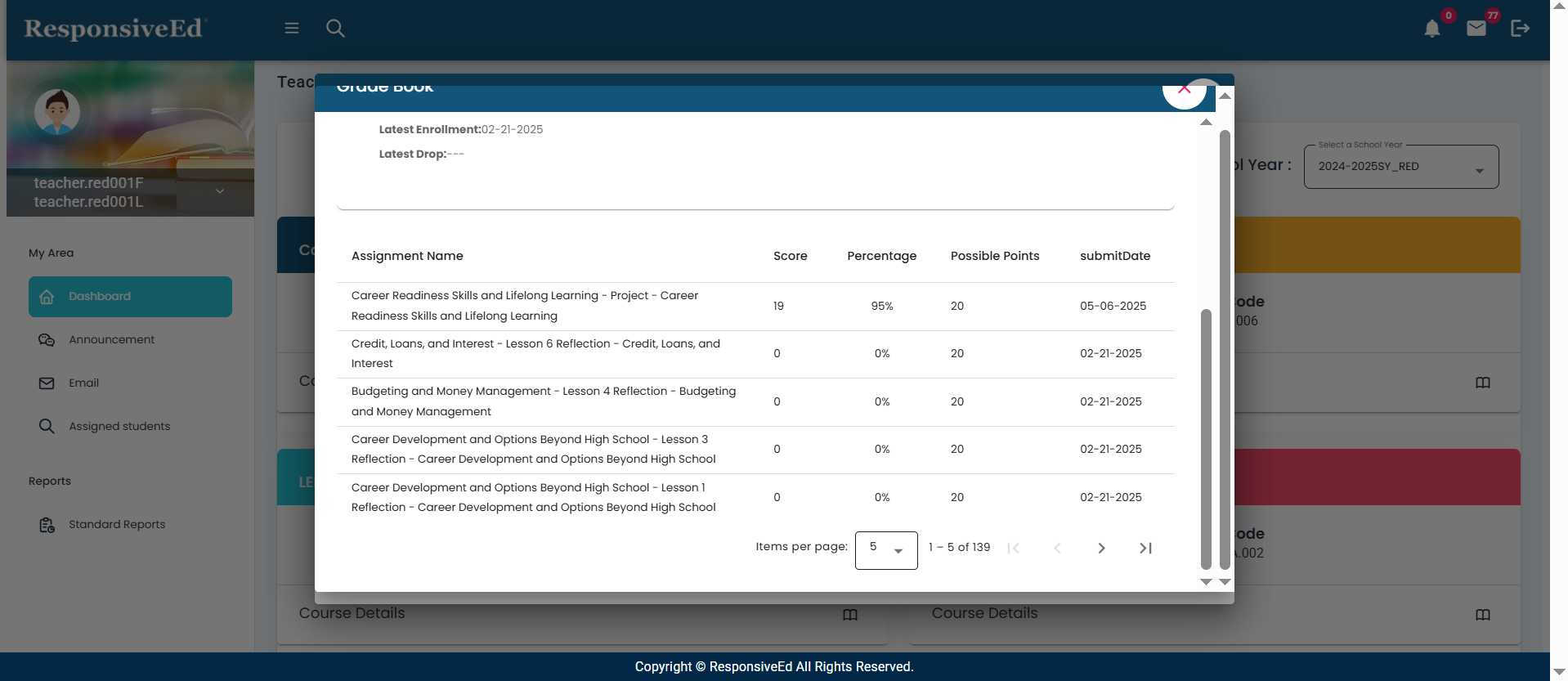The assigned courses will be displayed on your dashboard for the selected school year.