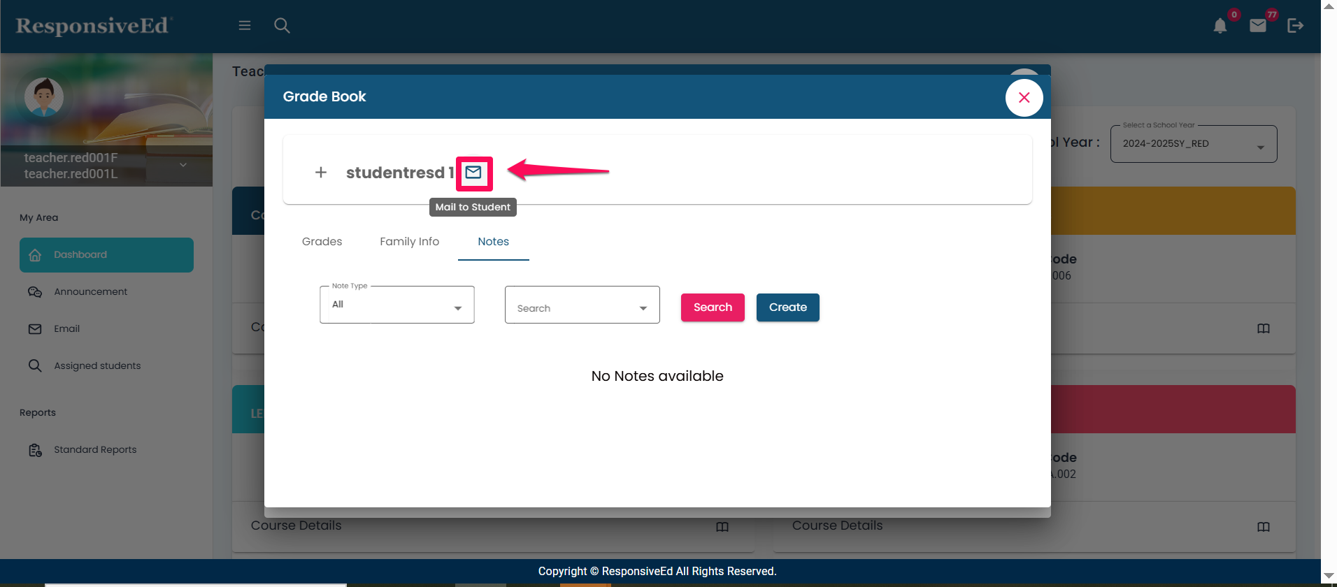 - An email can be sent to the student from the Grade book section by clicking the 'mail box' icon beside the student name.