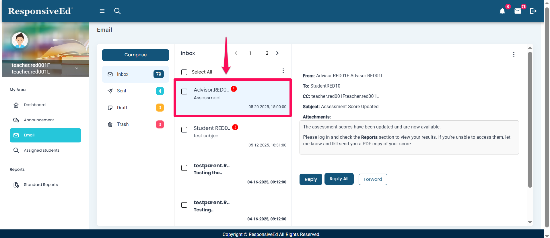 • Within the Inbox, click on the message to view more information which is displayed next to the Inbox.
