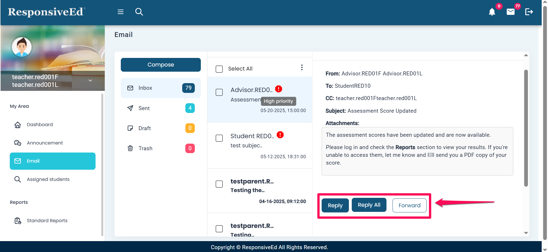 • You can reply to the sender, to everyone included in the message or forward the message to other users by clicking the 'Reply', 'Reply All' and 'Forward' buttons.