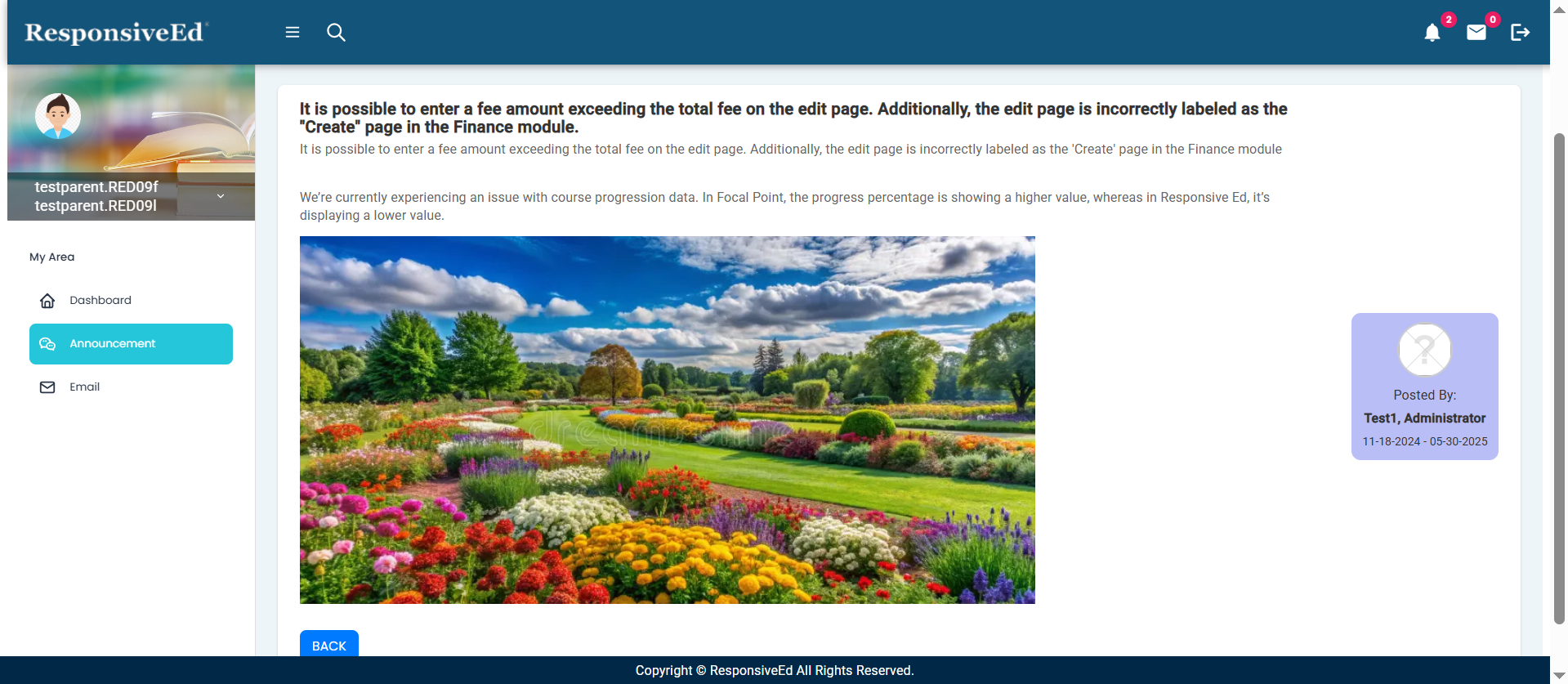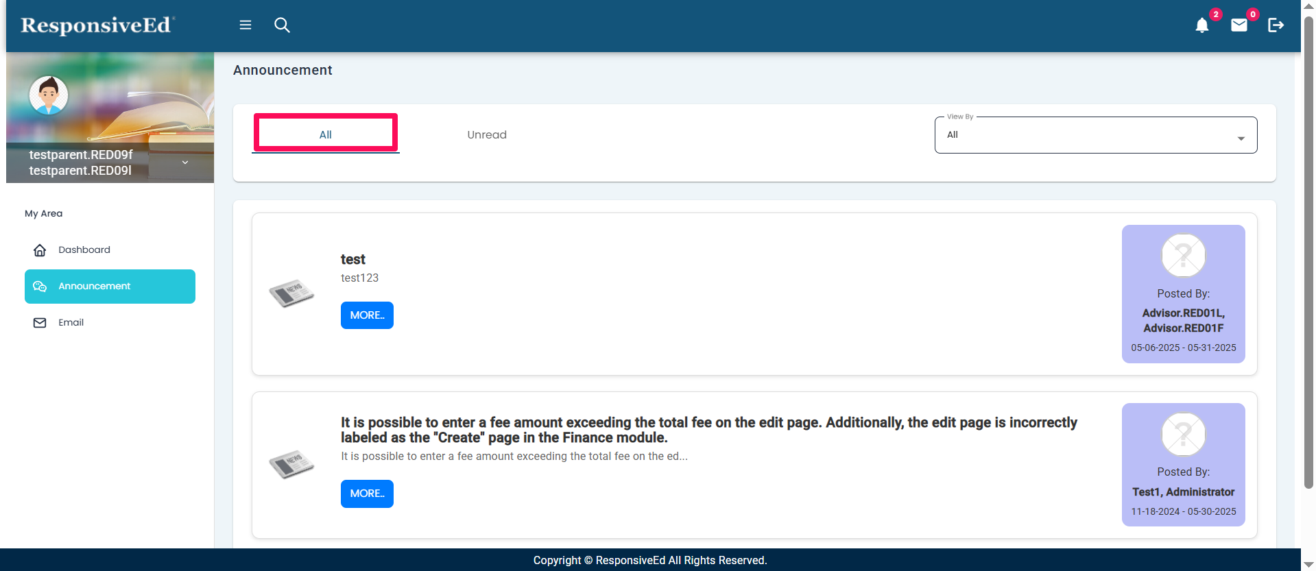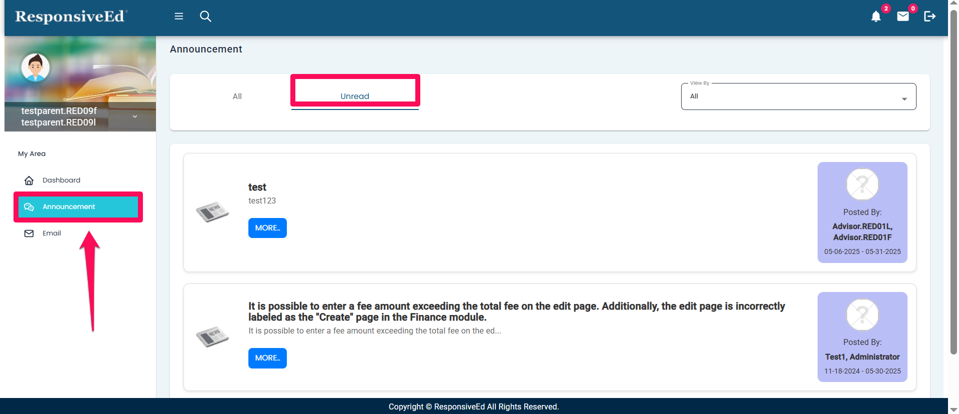 - Once signed in, select the 'Announcement' section from the menu on the left. You will be redirected to the Unread announcements page.
