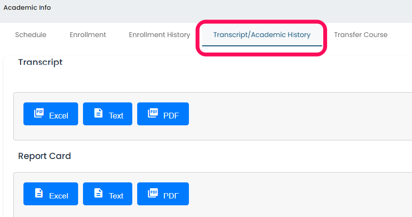 • Within the Academic Info section, click on Transcript/Academic History to proceed.