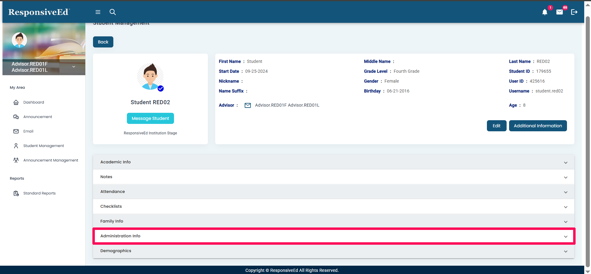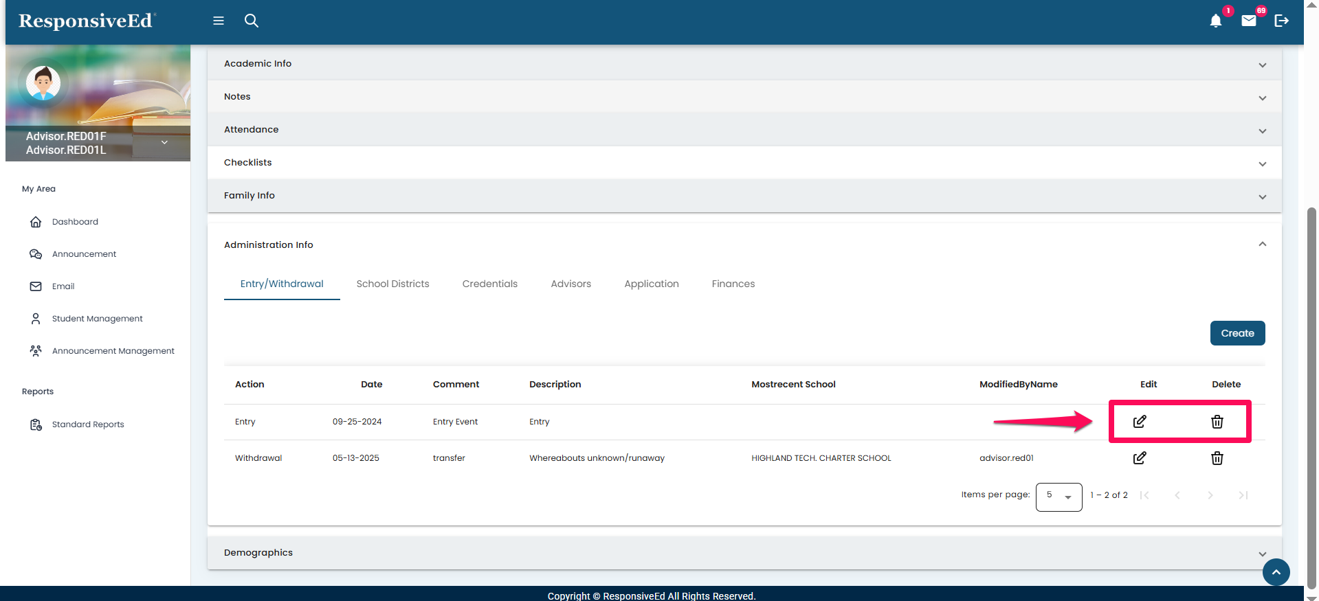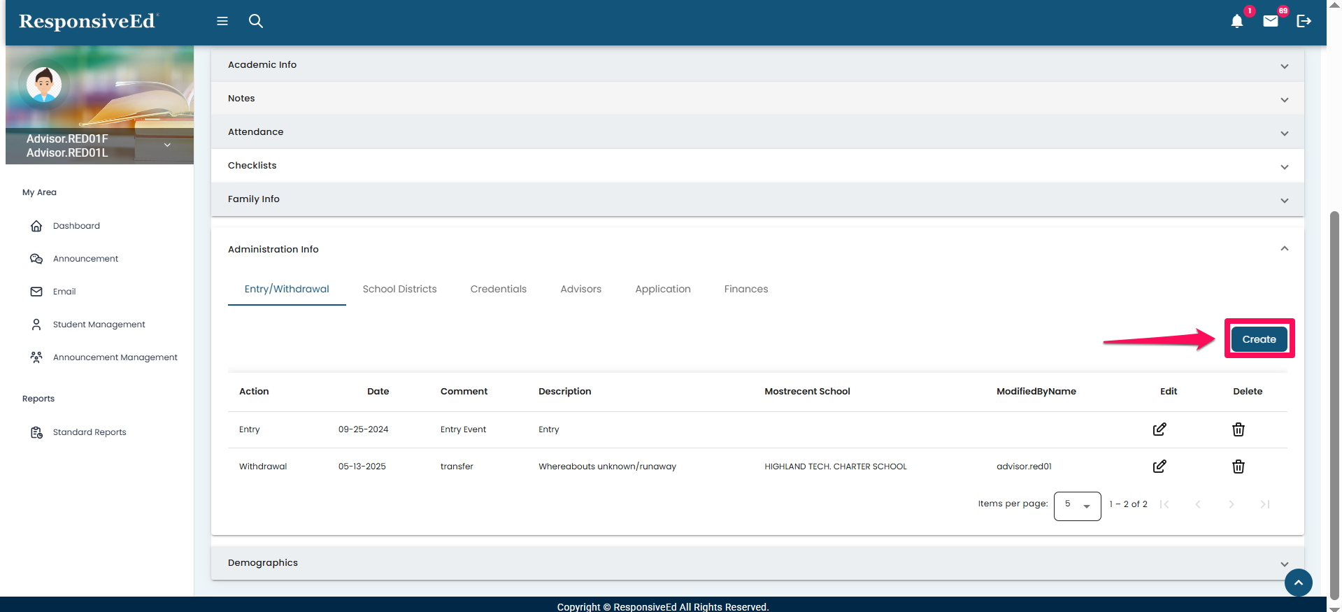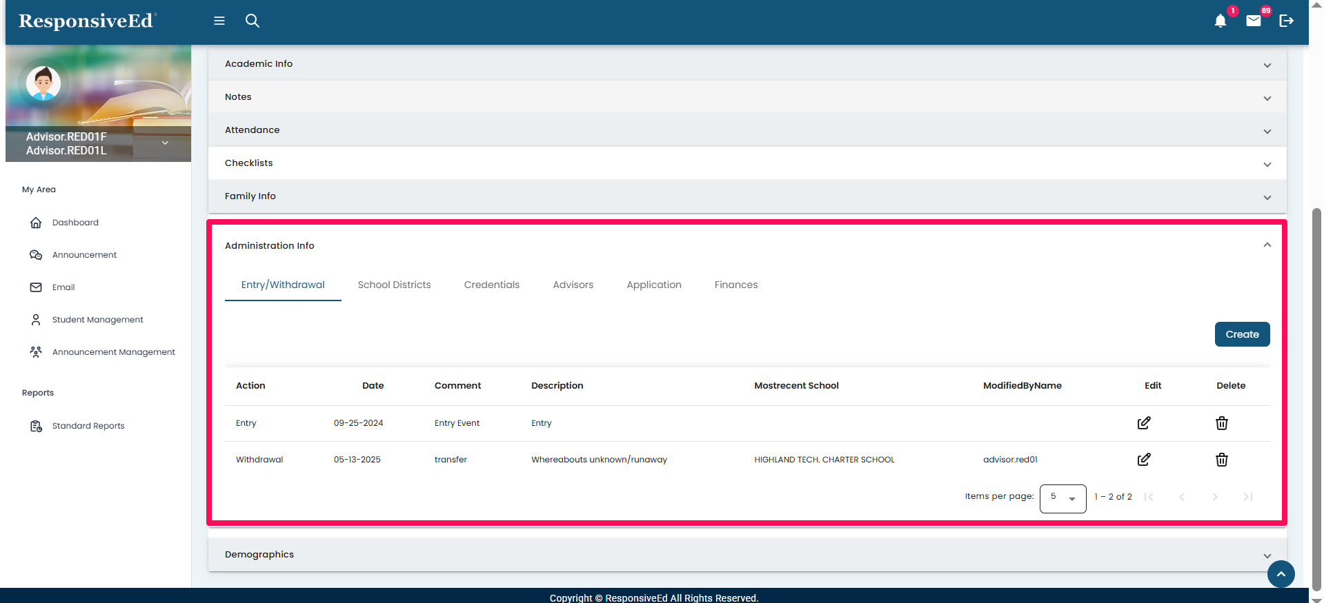 • Within this section, we can view student entry/withdrawal details, school districts, Credentials of student, list of Advisors, application details like application ID, Finances like fees, payment details, etc.