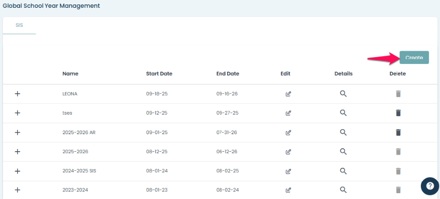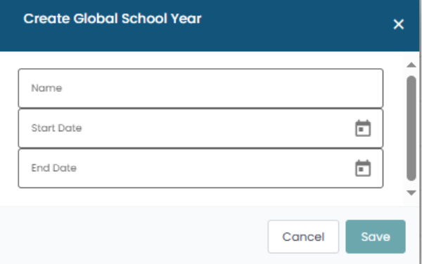• Select Global School year Manage (Left hand side menu) >> Click on Create >>Select the Start and End Date from the calendar >>Save
