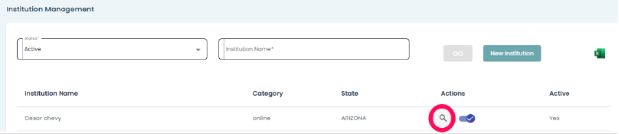 • To manage the institution setting click on search icon under action next to the institution name.