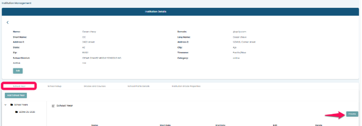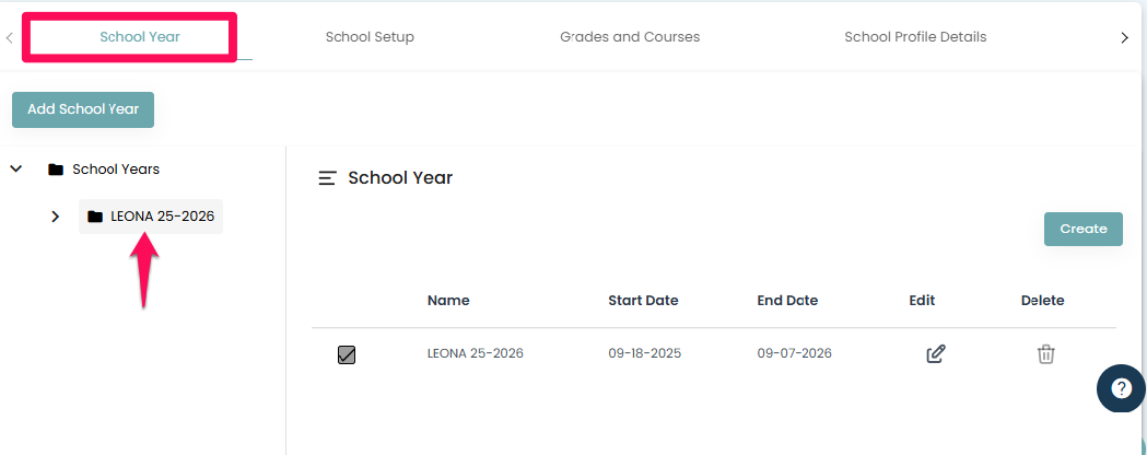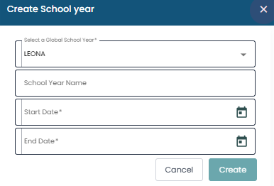 • To Set up school year select the section School year. And click on create Icon on the right-hand side.