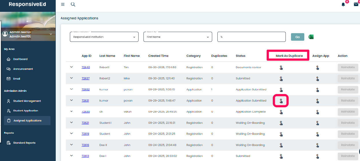 • Use the Select Institution dropdown at the top to filter applications by institution.