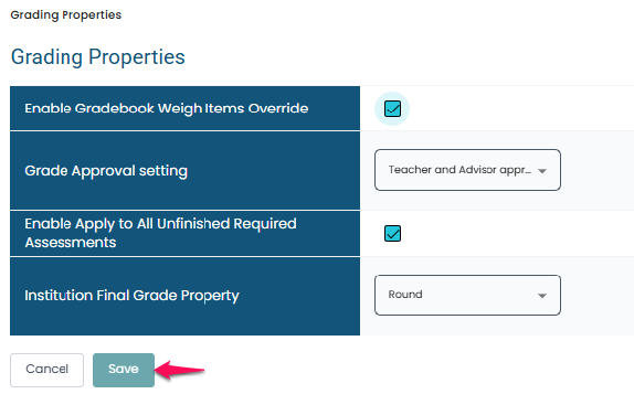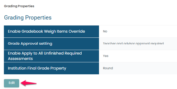 Institution Final Grade Property – Defines how final grades are calculated or displayed (e.g., rounding or truncate)