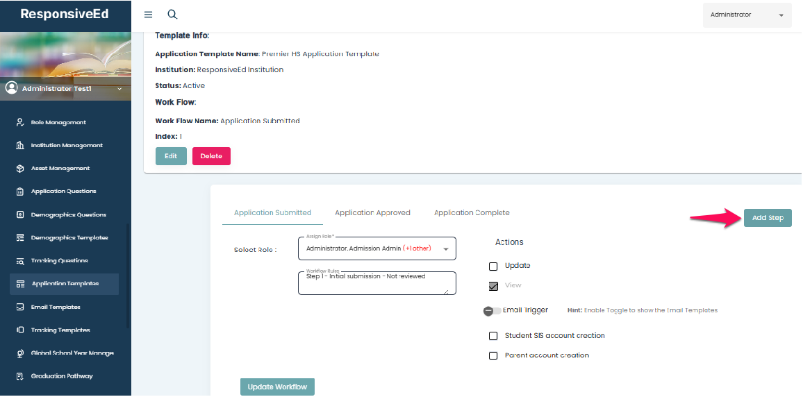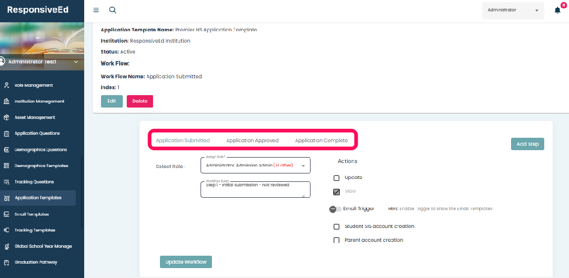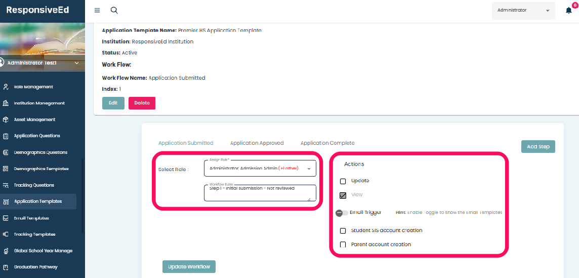 - Click on each workflow step section. From there, you can assign a role that will have access to approve the applications. In the Action column, you will also see several options that can be enabled as needed