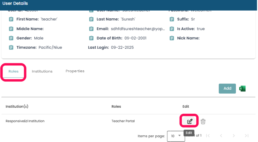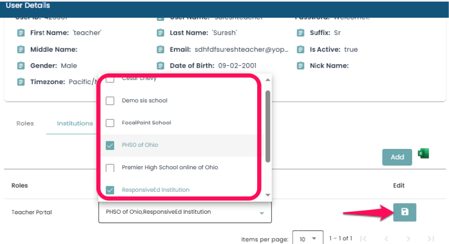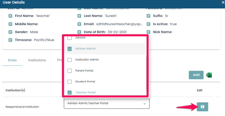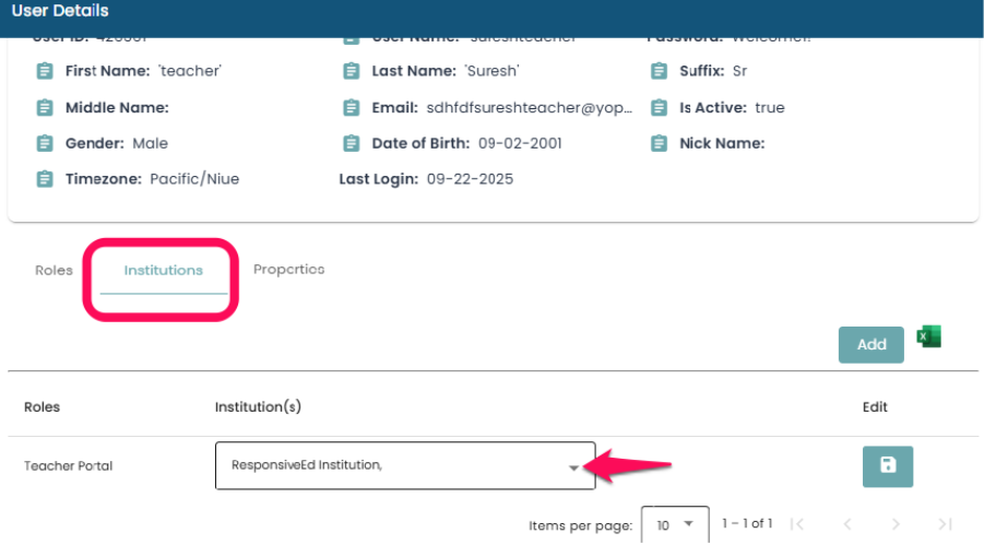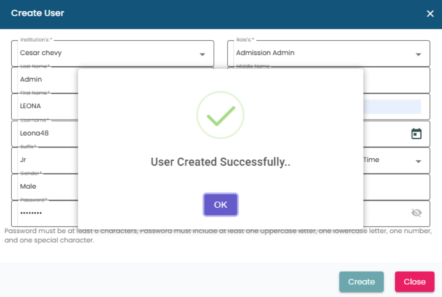 - Here, you can assign the institution and role to the user, create a username and password, and then share the credentials with them.