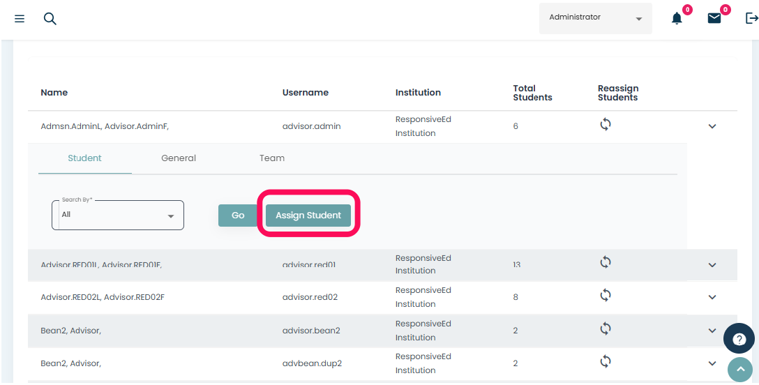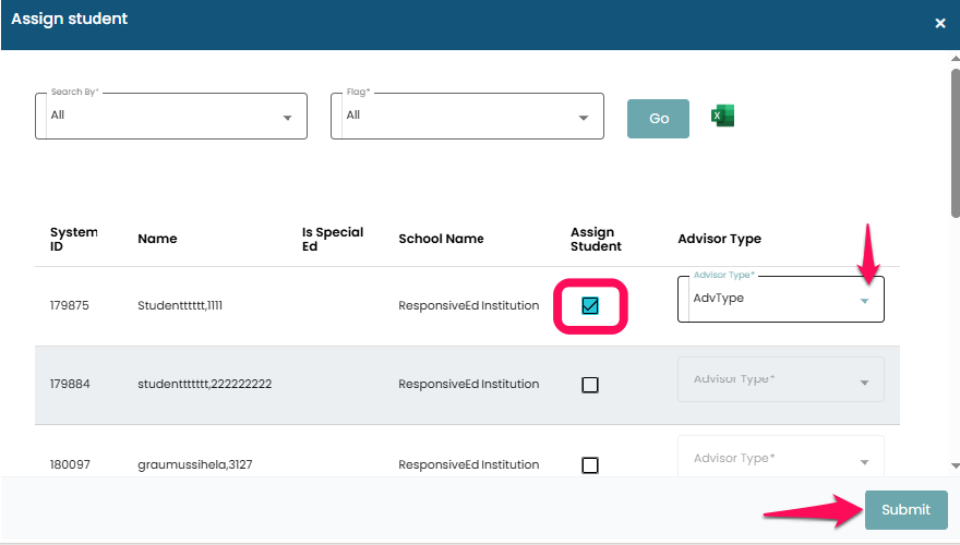 - Select the checkbox under the Assign Student column, choose the advisor type from the dropdown, and click Submit.