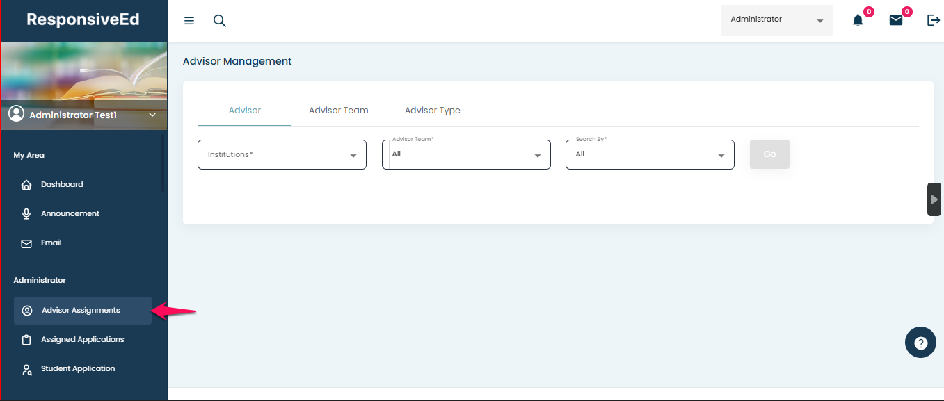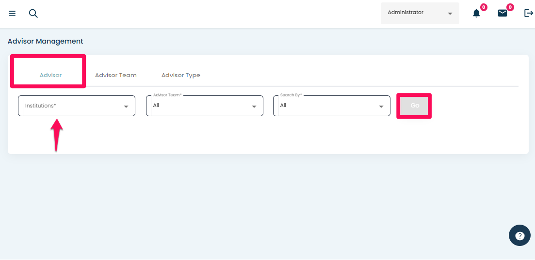 - Click the Advisor tab, select the appropriate institution and advisor team, and then click Go to proceed