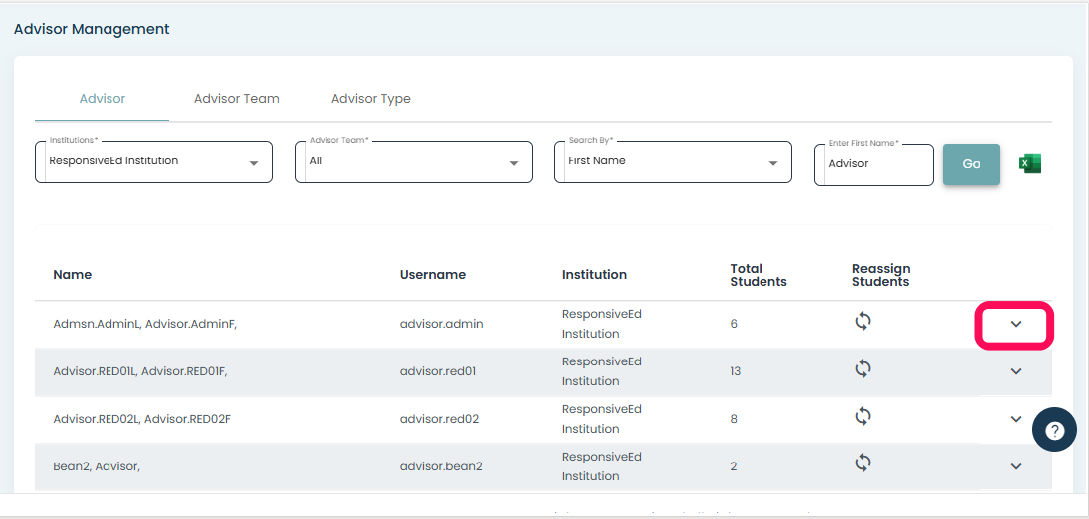 - A list of advisors will be displayed. Click the down arrow next to the advisor.