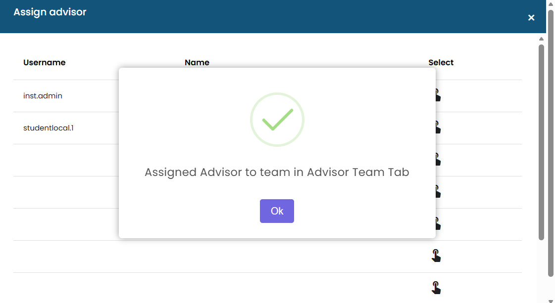 A pop-up will appear confirming that the advisor has been assigned to the team in the Advisor Team tab.