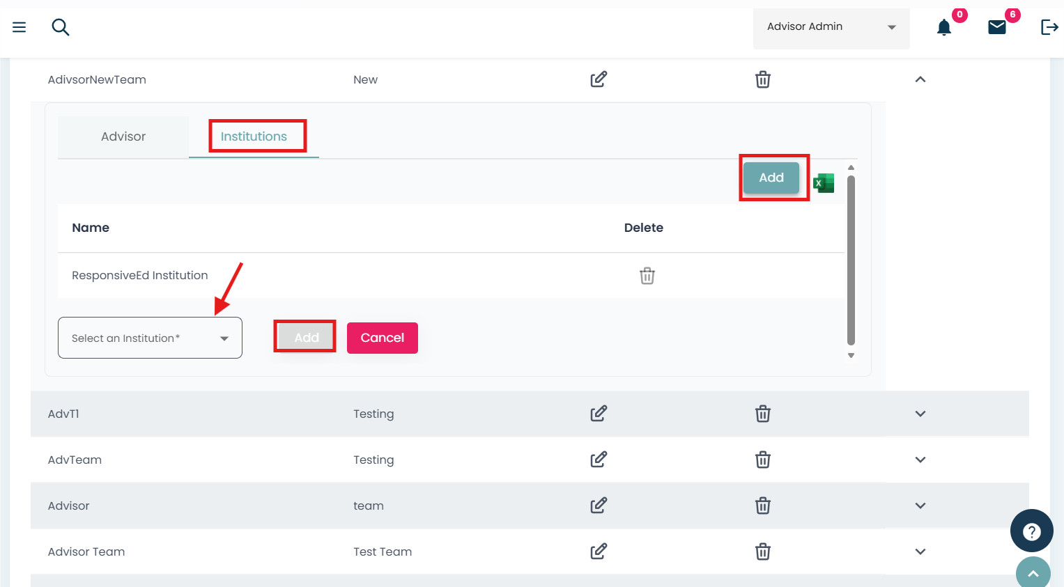 Go to the Institutions tab and click on Add and then select the institution from the dropdown and click on add.