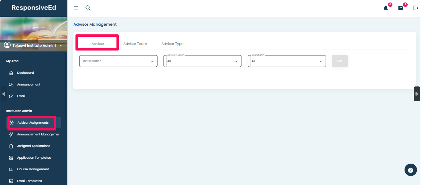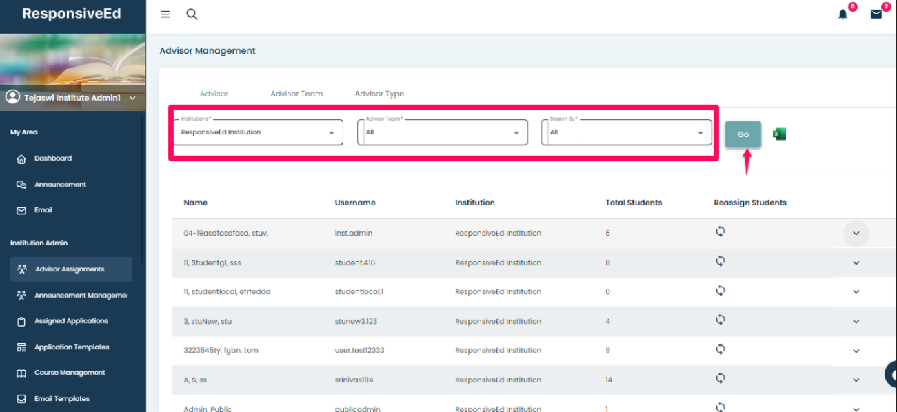 Select the Institution Name, choose the Advisor Team, and click GO.