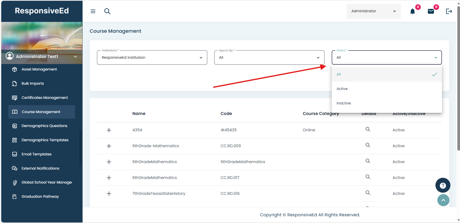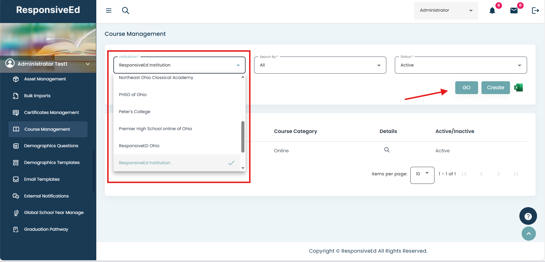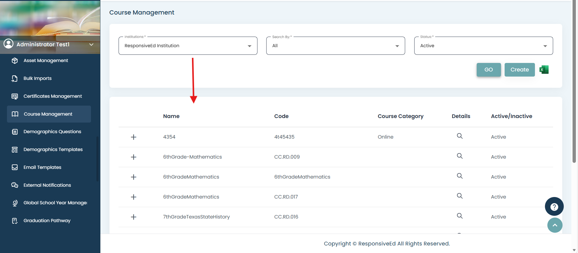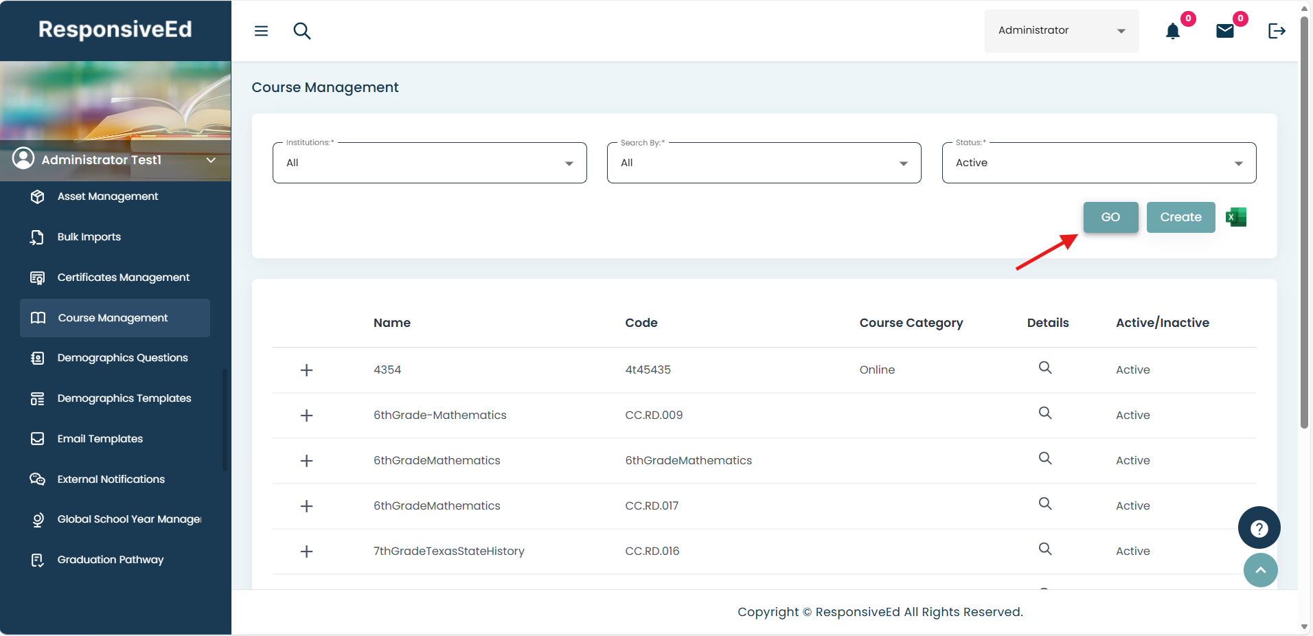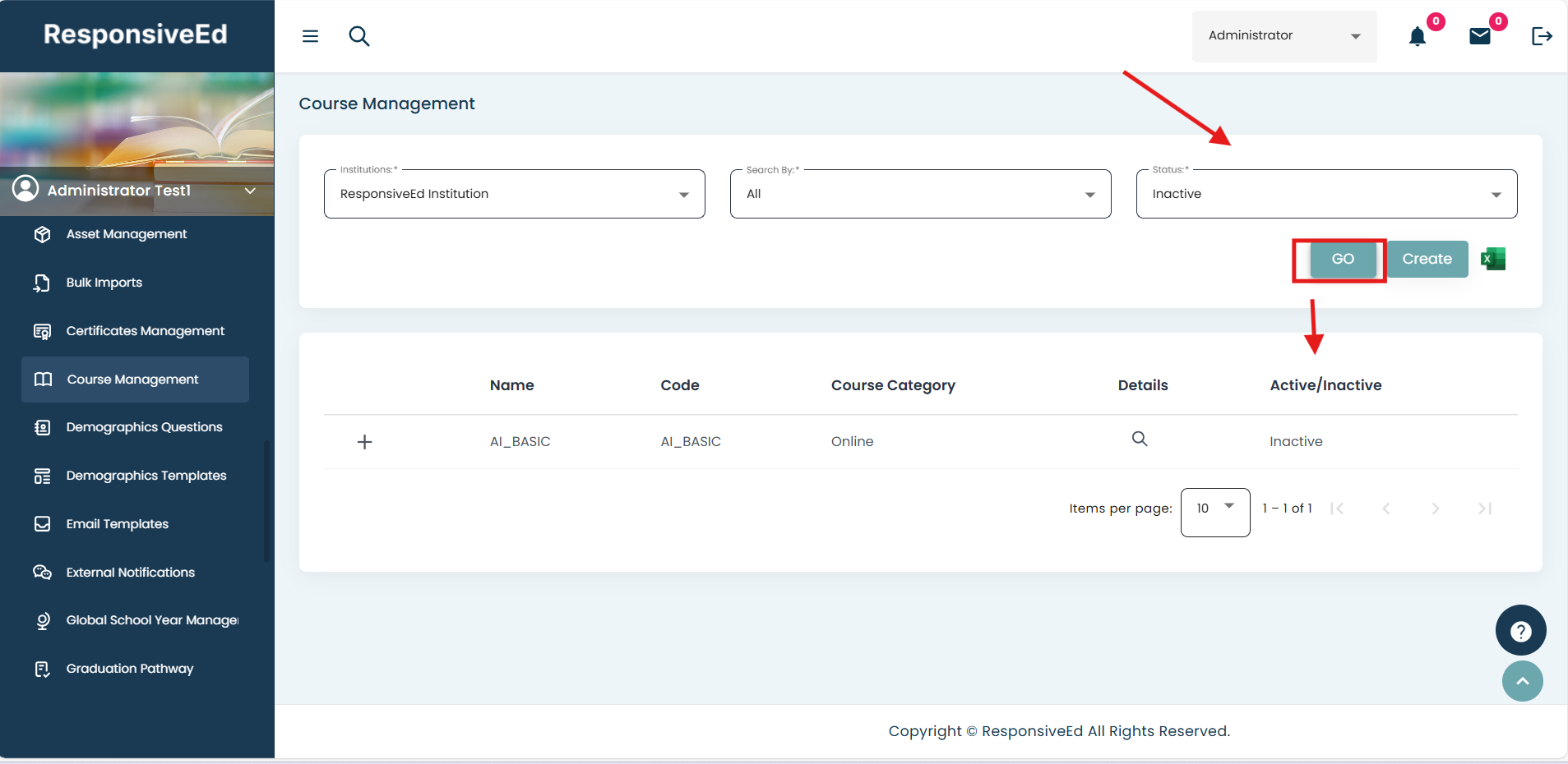 - You also have an option to view all the Inactive courses by choosing the course status from the "Status" drop down and click on "GO".