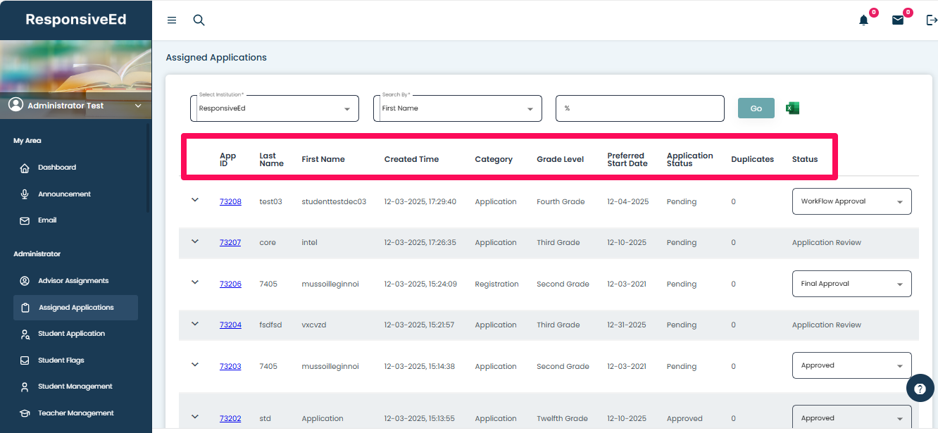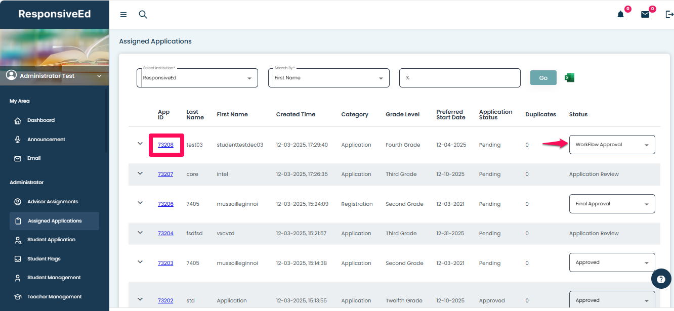 Status (Workflow stage such as Workflow Approval, Final Approval, Application Review, Approved)