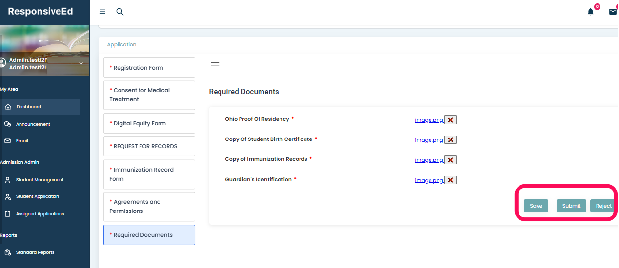 Inside the application, you can review each section where all the submitted student details, uploaded documents, and status updates.