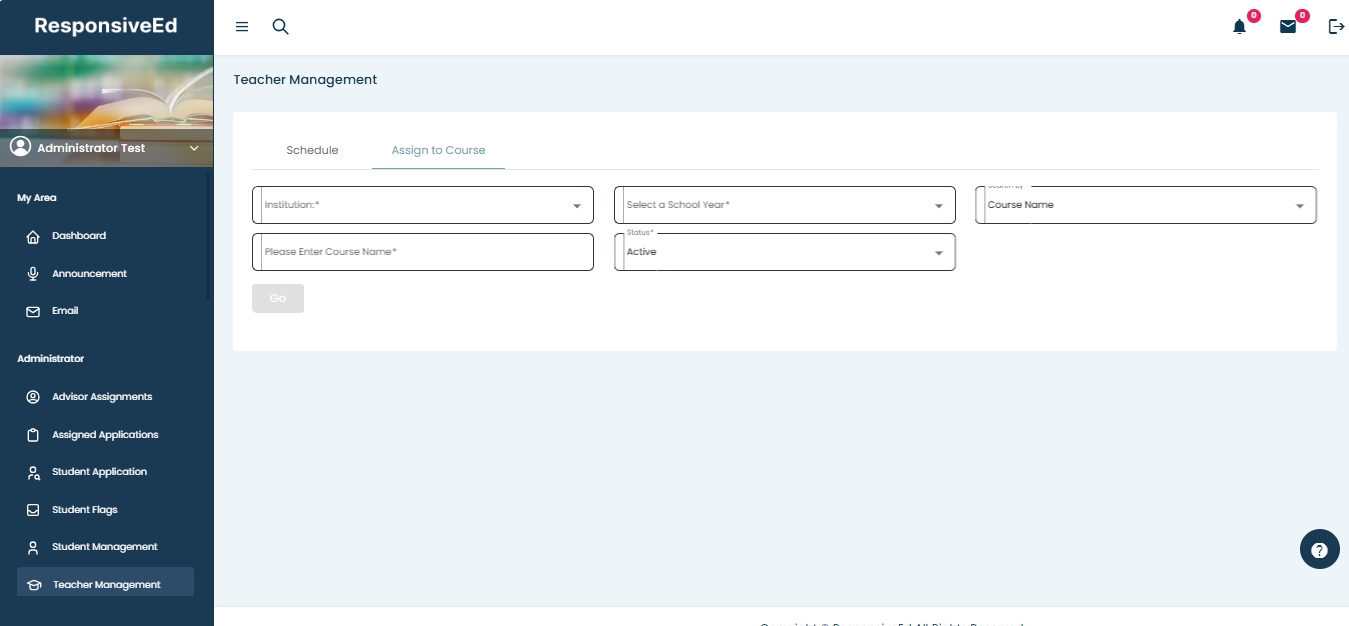 - Select the “Assign to Course” tab, fill in the required fields, and click on “Go” to view and assign teachers to the selected course.