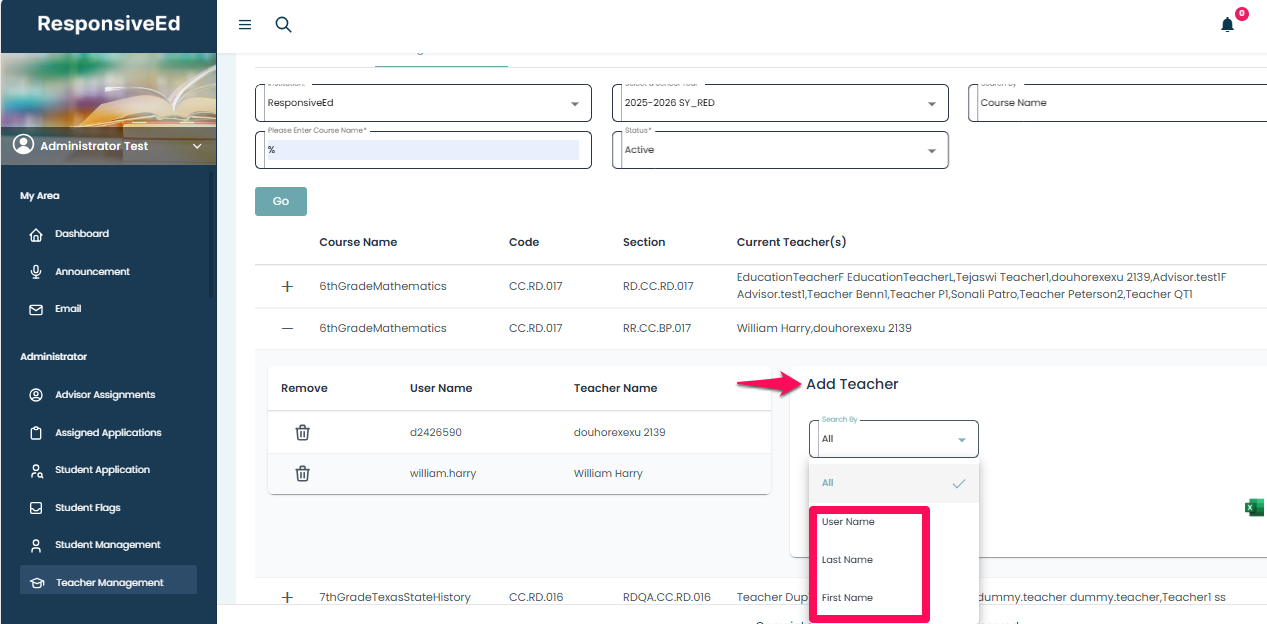 - To add a teacher to the course, go to the “Add Teacher” section, click on the dropdown, and select the teacher by username or name.