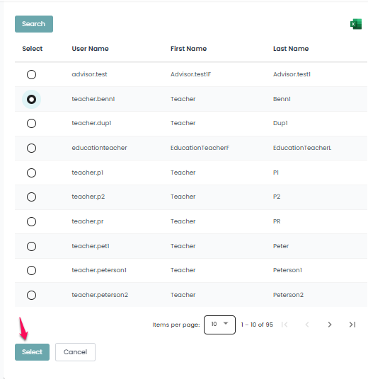 - Under the “Select” column, click the circle before to the teacher’s username, and then click on “Select” to add the teacher to the course.