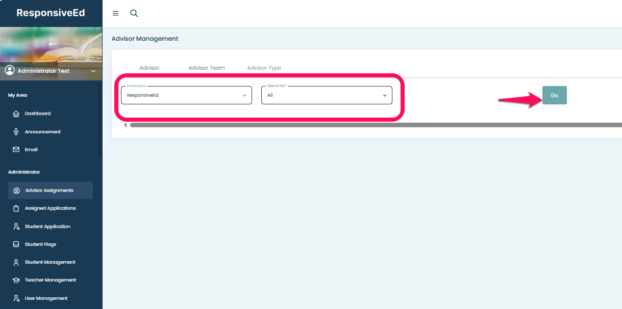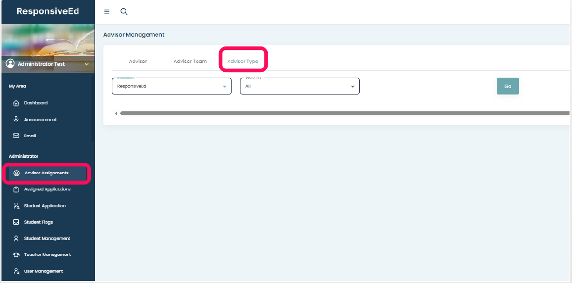 - Select the Advisor Assignment tab from the menu on the left, then choose the Advisor Type.