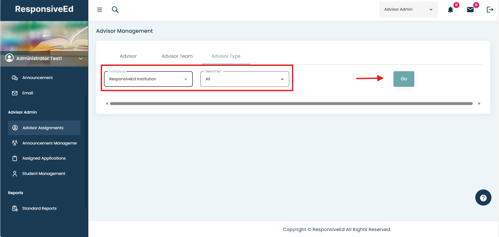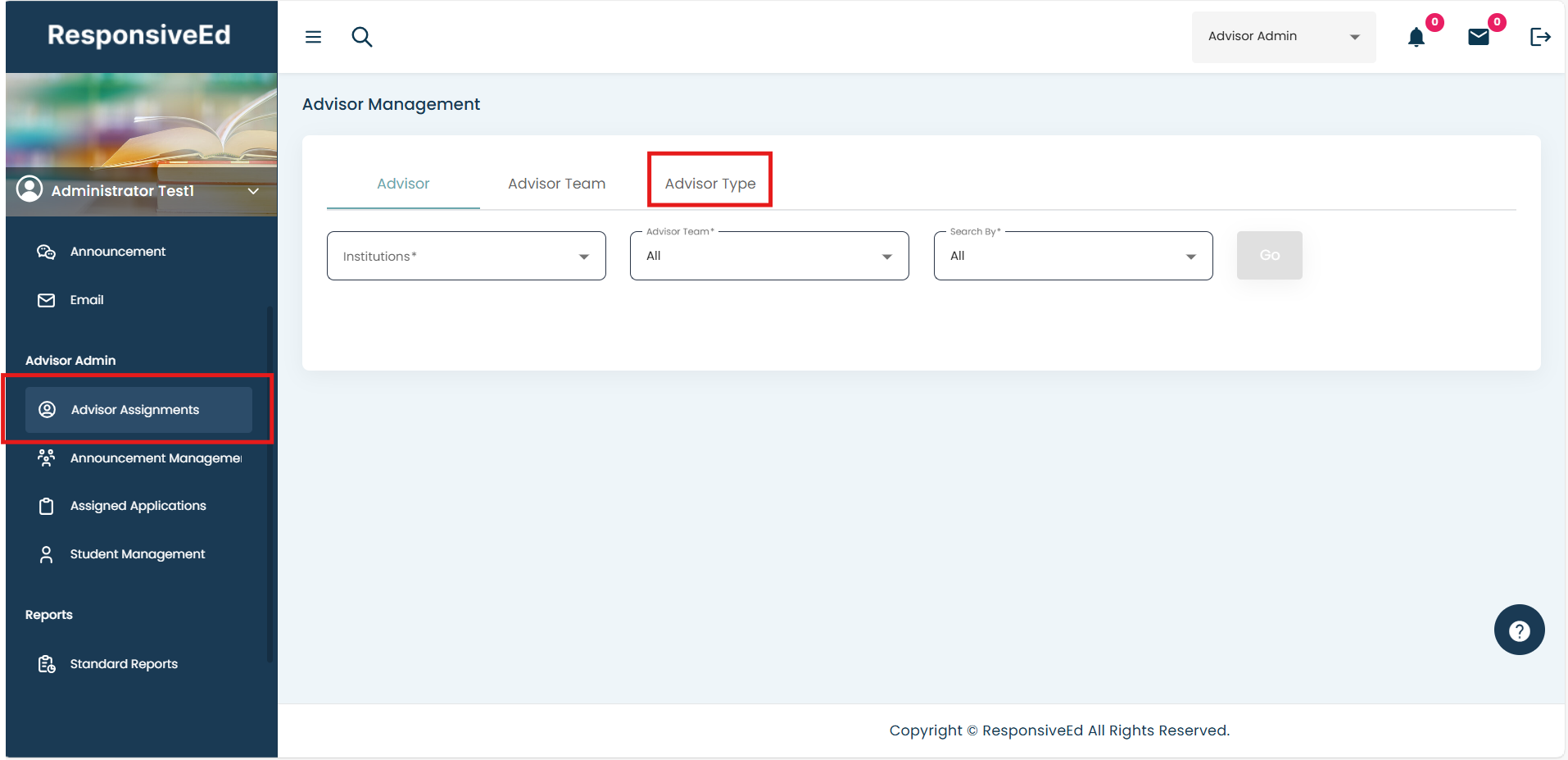 - Select the Advisor Assignment tab from the menu on the left, then choose the Advisor Type.