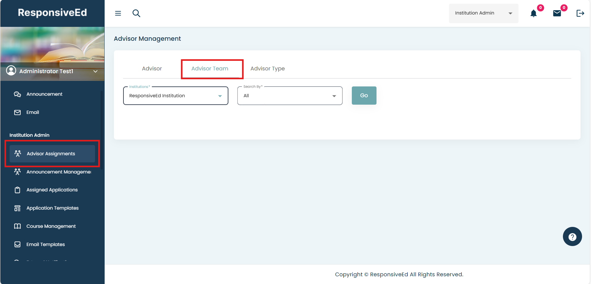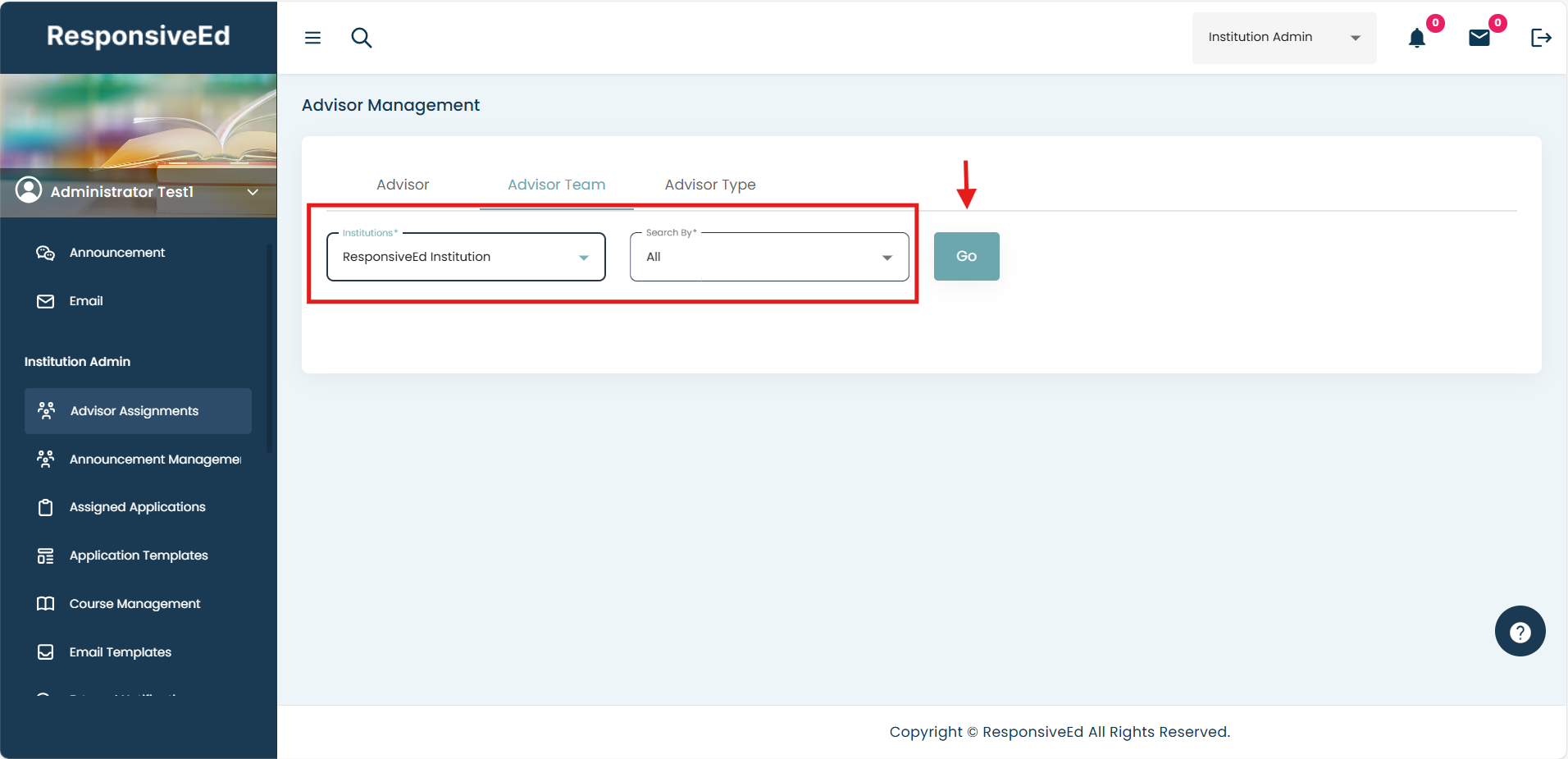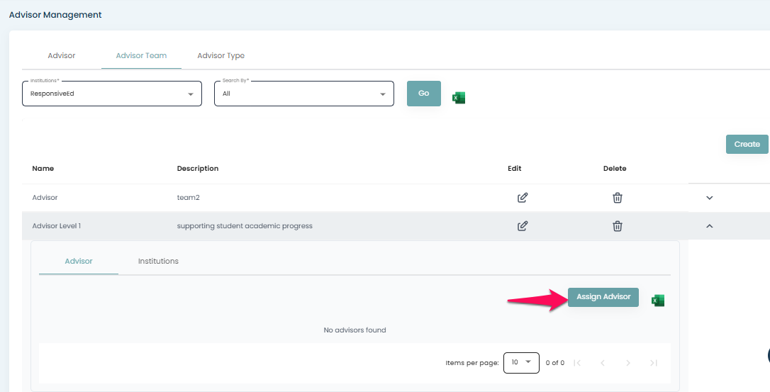 - Select the Advisor Assignment tab from the menu on the left, then choose the Advisor Team.