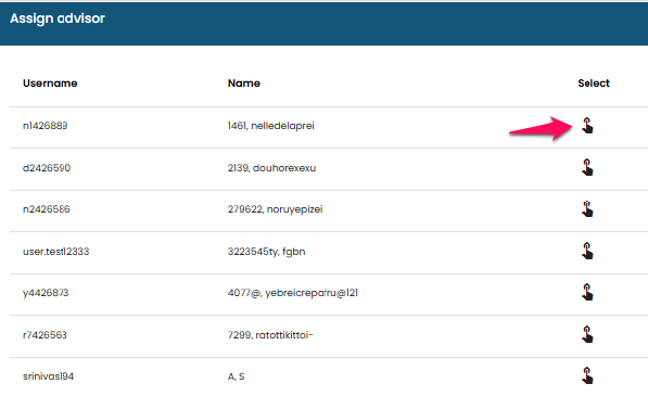 - Click on the finger pointing icon to select the advisor to the advisor team.