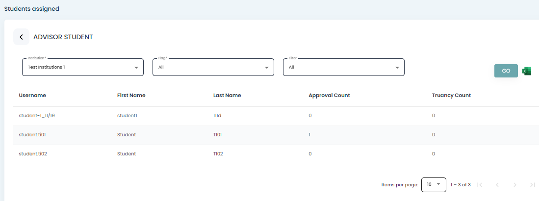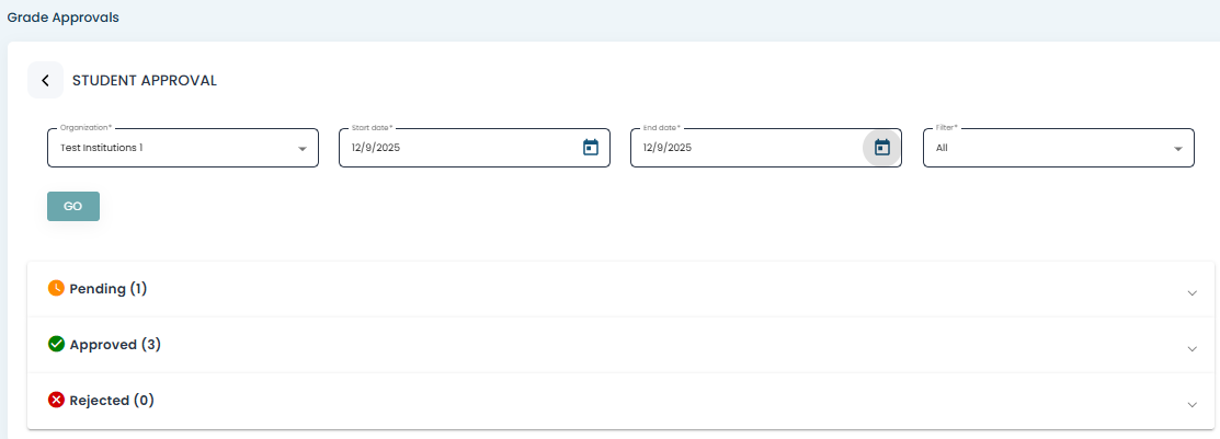 The Grade Approvals section in Advisor Admins to review and manage student grade submissions. Users can filter grade requests by Organization, Start Date, End Date, and Status, then click GO to view results.