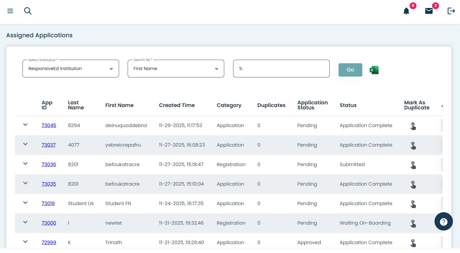This screen shows applications that have been allocated to a designated Institution admin, who is responsible for reviewing, processing, and approving them.