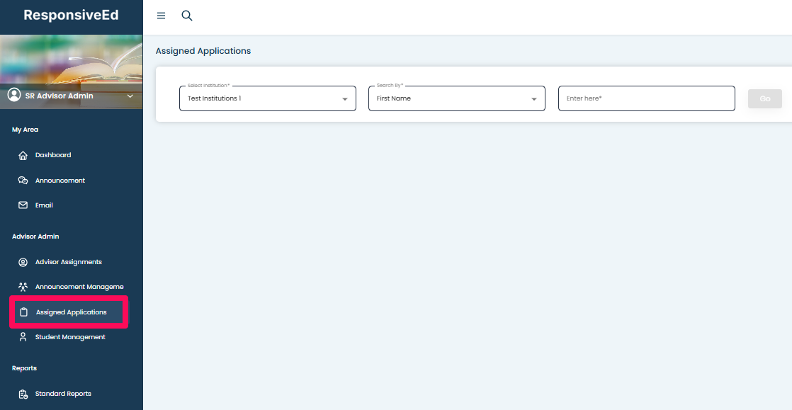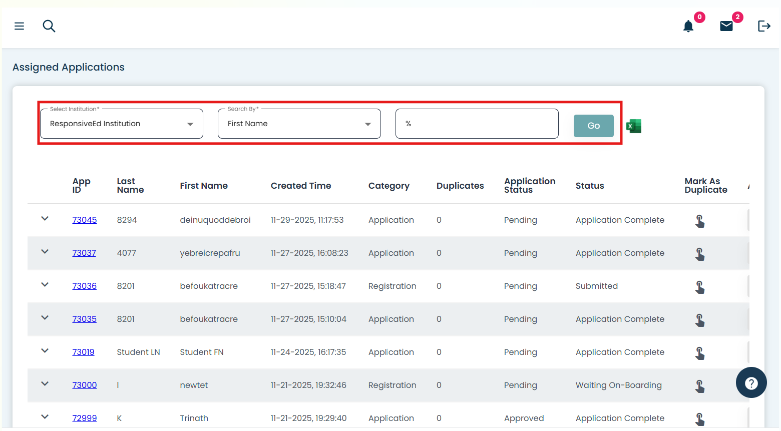 - At the top of the page, the “Select Institution” dropdown allows you to filter applications based on the chosen institution.