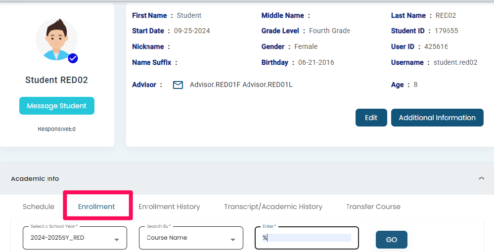 • Navigate to Enrollment under the academic info, select the desired option from the dropdown menu, and click Go